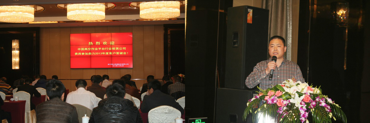 鼎力2013年度中国高空作业平台行业租赁公司客户答谢会在杭州星海国际大酒店举行,来自赫兹、宏信、金和源、环实、利星行、诚腾、进大等国内60多家租赁公司共120余人参加。