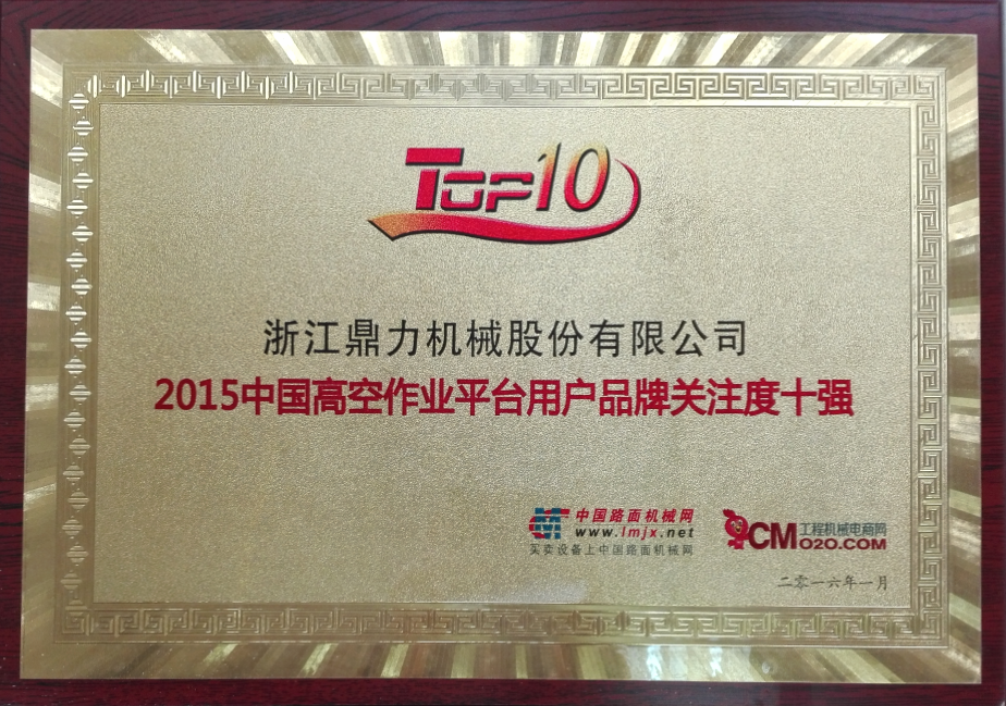 鼎力被评为2015中国高空作业平台用户品牌关注度十强品牌。该项荣誉真实反映了行业用户对浙江