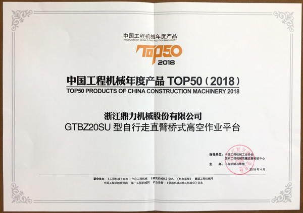 由《工程机械与维修》杂志发起并主办的工程机械产品发展(北京)论坛暨中国工程机械年度产品TOP50评选活动,在业内最具活力和影响力。工程机械产品TOP50也是中国工程机械行业年度产品最高的荣誉奖项。浙江鼎力已经连续多届,多款不同型号产品荣膺该奖项。