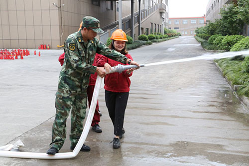 最后进行了消防水带连接和使用演练。吴教官现场示范了消防水带连接使用的具体步骤,讲明了水带接口连接和使用水枪的方法。演练中,大家密切配合快速反应,有效掌握了如何正确使用消防水带。