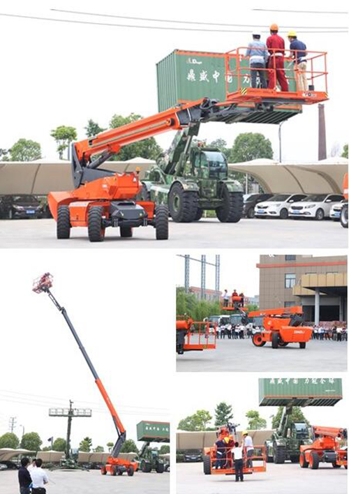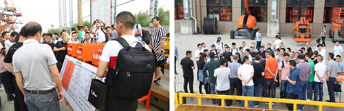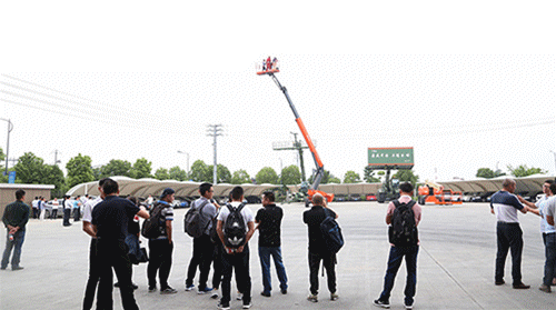紧接着,在发货场地上,鼎力新臂式演示及体验活动拉开帷幕。在技术人员的操作演示下,租赁公司客户们认真观看每一个细节。
