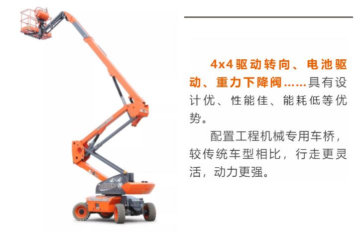 ▶ 最大工作高度22米,工作人数多人。 ▶ 全行程最大负载750kg,且整机可正常行走。 ▶ 工作平台尺寸4,59m*2,25m,延伸平台尺寸2,7m,作业范围更广。 ▶ 整机离地间隙更高,达到0,4m,通过性更强。 ▶4x4驱动转向,转弯半径1 糖心视频高清,25m/3,4m,灵活性更高。3、车桥款电动曲臂:BA20ERT。