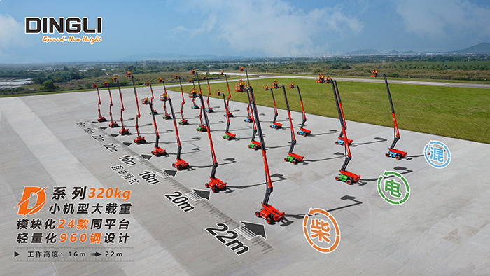 近期,在原有16~22米臂式基础上,鼎力推出升级款小机型大载重D系列模块臂式,全系列全行程大载重达到320kg,共24款,柴,电,混动(各8款)同平台 糖心视频在线,包含4款曲臂,4款直臂。